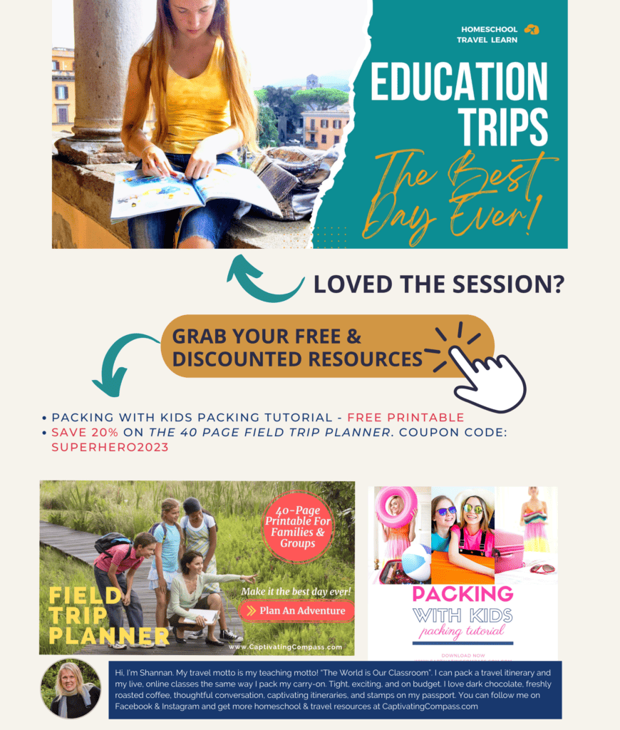 I hope you enjoyed the ‘Smart Travel Super Heroes: Family Travel That Counts’ session and the ‘Education Trips: Make It The Best Day Ever!’ sessions. during the Homeschool Super Heroes conference.
